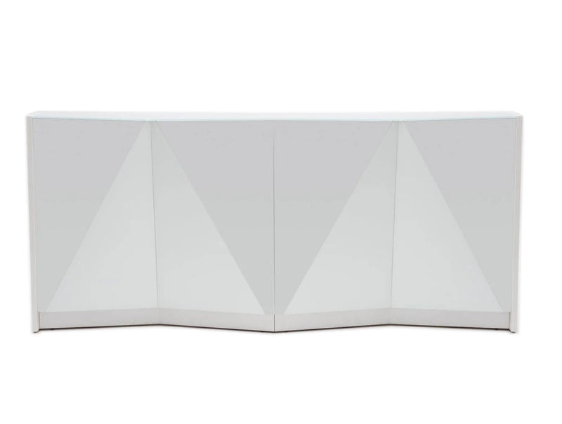 Recepcijski pult Alpa sa staklenom pločom može se pohvaliti modernim minimalističkim dizajnom čistih linija sa sjajnom staklenom prednjom stranom i postoljem s elegantnim LED svjetlima. Recepcijski pult se može prilagoditi u bojama i oblicima po želji.