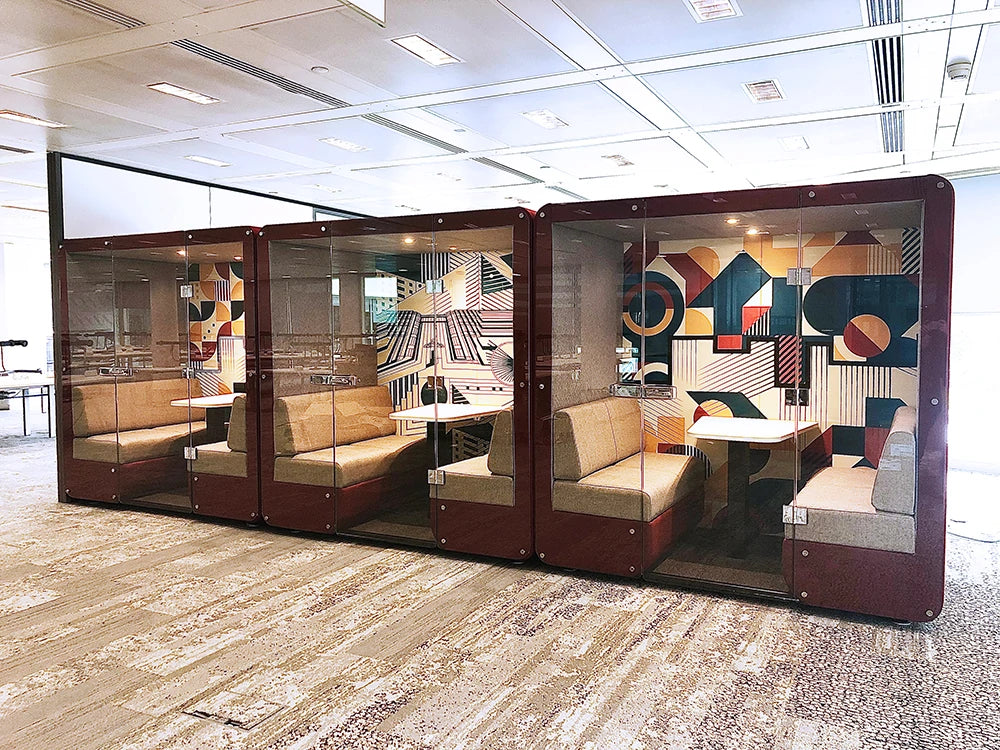 Upoznajte Bob pod za sastanke za 2 osobe sa staklenom prednjom i stražnjom stranom. Kolekcija Bob sa staklenim vratima nudi udobnost i veću privatnost. Dizajn, temeljen na mobilnim uređajima, koristi velike ravne ploče i meke zaobljene kutove koji ne samo da izgledaju sjajno, već smanjuju i apsorbiraju zvuk.