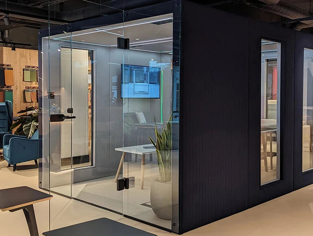 Kolekcija Bob Rooms kombinira udobnost i privatnost sa svojim lijepo tapeciranim velikim panelima i mekim zaobljenim kutovima. Dizajniran da apsorbira neželjene zvukove, poboljšava privatnost u svakom prostoru. Prilagodite do 10 staklenih prozora (4 lijevo, 4 desno i 2 straga) kako bi odgovarali vašim potrebama. Imajte na umu da se zidni TV nosač može dodati samo na tapeciranu ploču, a ne na zid staklenog prozora.