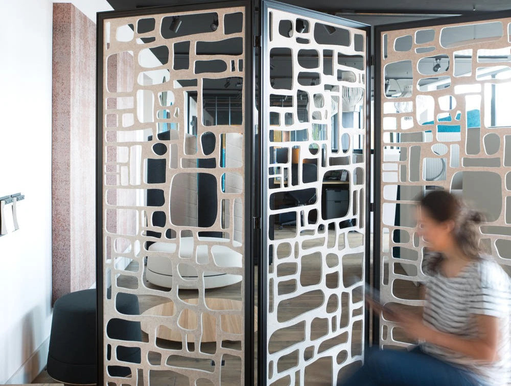 BuzziFalls, naša razigrana sobna pregrada koja je lansirana 2014., također je dostupna u samostojećem sklopivom paravanu. 'Trio' verzija se sastoji od 3 panela i idealna je za pregradu vašeg ureda ili sobe kako god želite. Izrađene od dvoslojnog BuzziFelta, ove ploče za upijanje zvuka precizno su izrezane s odvažnim uzorcima, dostupne u nizu biofilnih i geometrijskih dizajna. U prostoru pomaže u smanjenju prijenosa zvuka i ublažava visoke tonove kao što su melodije zvona uz zvukove tipkanja i klikanja.