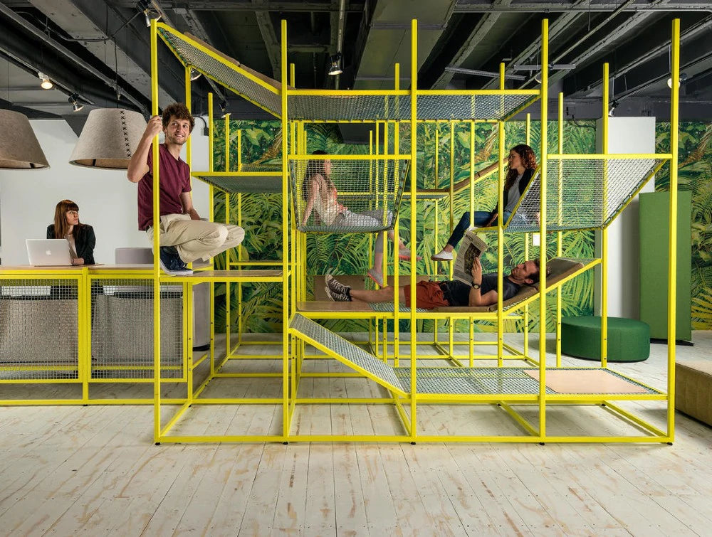 Popnite se, upoznajte se i opustite se u ovom okomitom tornju za razgovore. Sa svojim lakiranim čeličnim okvirom stvara urbanu atmosferu u velikim i malim prostorima dok istovremeno pomiče granice tradicionalnih radnih mjesta. Inspiriran prirodom, BuzziJungle nudi rješenje za konvencionalni prostor za sastanke. To je odraz naše vizije društvenog ureda i daljnjeg pomicanja tradicionalnih granica radnog mjesta. Pružite priliku za različite interakcije unutar "džungle".