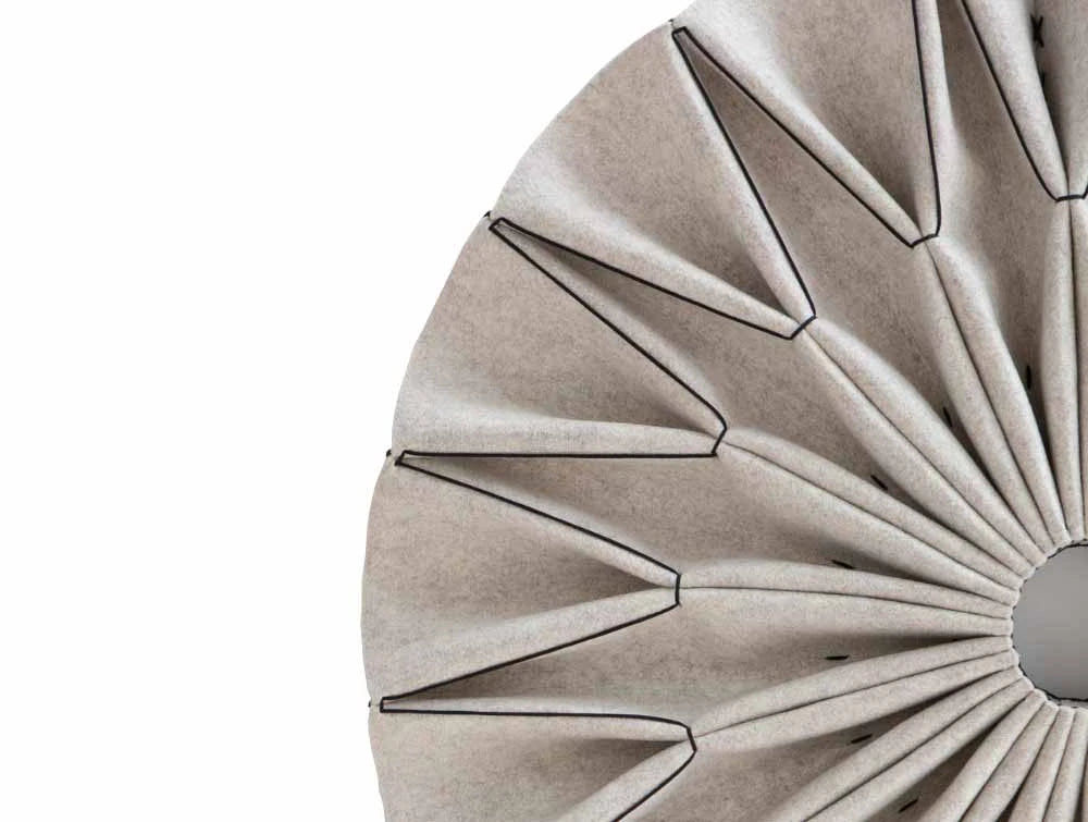 Doživite iznimnu akustičnu izvedbu BuzziPleat-a koju pružaju njegovi arhitektonski nabori. Velike, ali lagane skulpturalne forme mogu se objesiti na strop ili postaviti na zid. Ova serija reinterpretira drevne tehnike korištene u modnom dizajnu, poput smockinga i plisiranja, kako bi se povećao volumen u akustične svrhe. Tradicionalni zanat ručnog nabora i vezivanja, koji zahtijeva mirnu ruku i oko za detalje, traje više od 2 sata za svaki BuzziPleat.