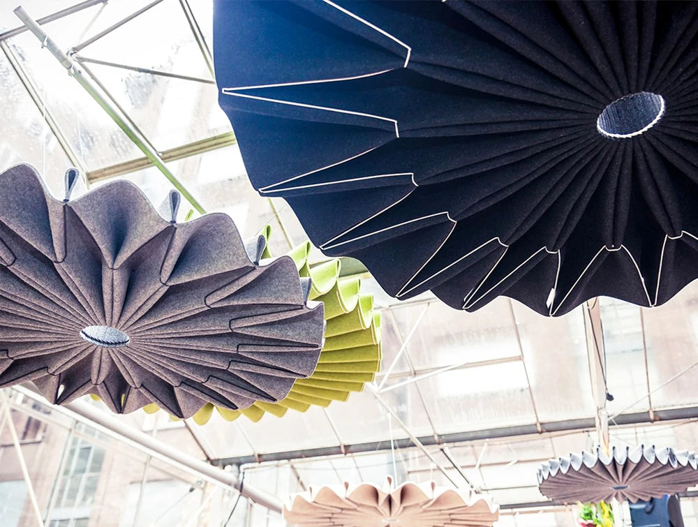 BuzziPleat Ripple je viseća stropna svjetiljka s ručno izrađenim naborima koji pružaju izvrsnu akustičnu izvedbu