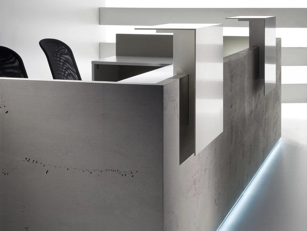 Ovaj recepcijski pult karakterizira pojednostavljena struktura za kombiniranje estetike i funkcionalnosti. Prijemna jedinica ima staklenu prednju stranu zajedno s LED svjetlima ugrađenim u postolje što daje estetsku privlačnost.